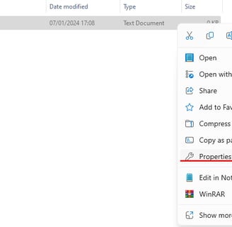 Before starting this tutorial, you must be an administrative user to configure file permissions, so if you are on a standard user account you will not be able to do this (unlucky). To begin, right click the file in question and select "Properties":