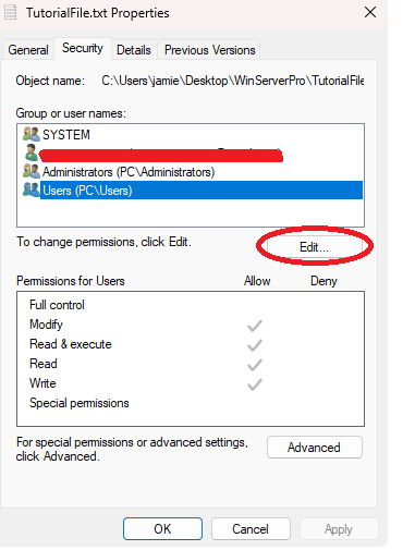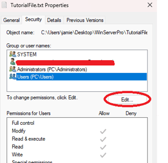 This will open the Properties window. From here, select the "Security" tab, the User / Group you want to configure and click "Edit". For example, I will be editing the Users group: