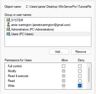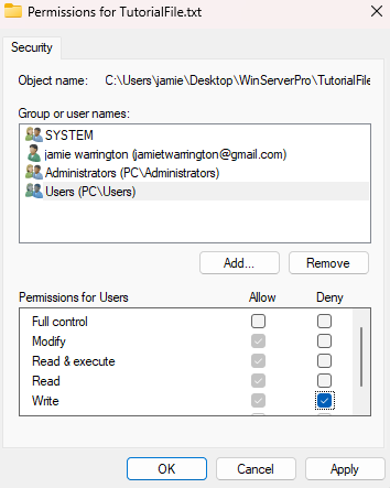 For the sake of this tutorial, I am going to be denying the user group from writing to this file. As deny takes precedent over allow, upon clicking "Apply" users from the standard user group won't be able to write to this file.