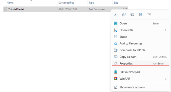 Before starting this tutorial, you must be an administrative user to configure file permissions, so if you are on a standard user account you will not be able to do this (unlucky). To begin, right click the file in question and select "Properties":