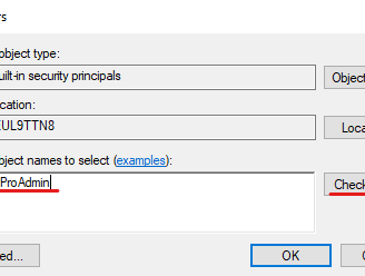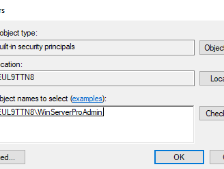In the next Window, you must enter the exact username that you inputted for the new user. For me it is "WinServerProAdmin", so I type that and then click "Check Names". This should automatically type in the full domain name of the user: