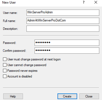 This will bring us to the menu where we are going to create the login details for the user and also sort some security settings out. Simply fill out this Window with the relevant information for you, bare in mind that the "Full name" is the display name shown on Windows for the user: