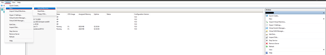 After you have opened the Hyper-V Manager, head to the “Action” tab at the top of the screen, hover over “New” and select “Virtual Machine…”: