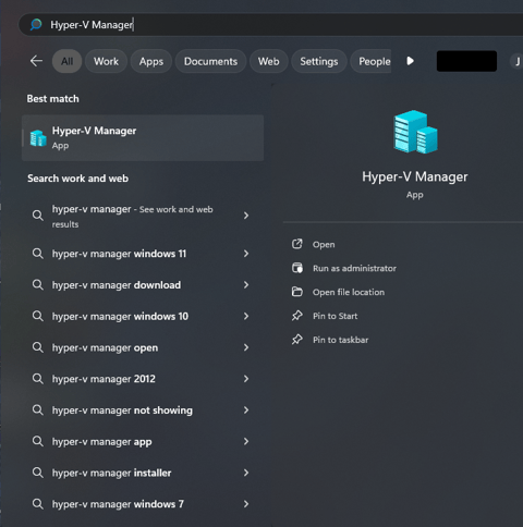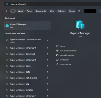 The first step is to open the Hyper-V manager, which can be found by searching for it in the bottom left-hand corner of your screen: