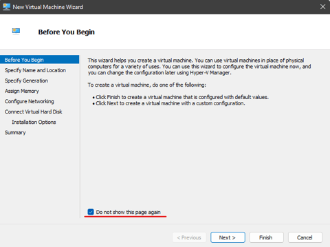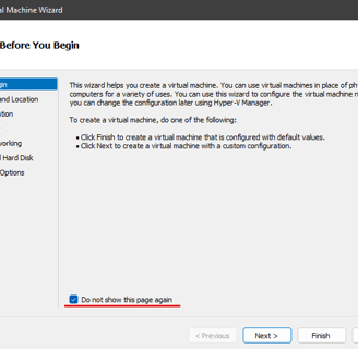 This will open the “New Virtual Machine Wizard”. This is where we will be allocating resources for the virtual machine as well as setting up some networking settings. Firstly, simply click Next to skip the before you begin screen, to enter the first part of configuration (Feel free to rick “Do not show this page again” as it doesn’t serve much purpose):