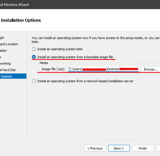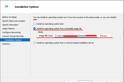 The final step to creating the virtual machine is to select the ISO file that you wish to install. In this case, it will be a Windows Server 2019 ISO file. Select “Install an operating system from a bootable image file”, click “Browse” and locate your ISO: