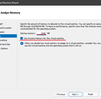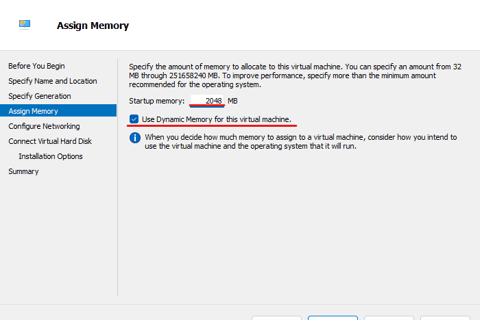 Once you have selected the generation of your virtual machine, it is time to decide how much RAM you wish to allocate to the machine. Microsoft recommends that you have at least 800MB of RAM for Windows Server 2019 machines, but depending on your setup you may want to allocate more. For this tutorial I am going to allocate 2GB of RAM which is 2048MB. The Dynamic Memory option allows Hyper-V to automatically manage RAM allocation based on the needs of the virtual machine, this should be ticked: