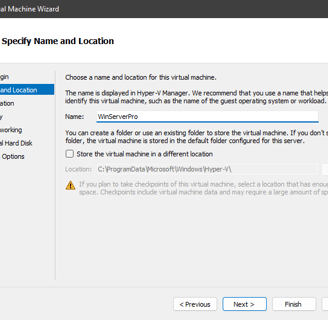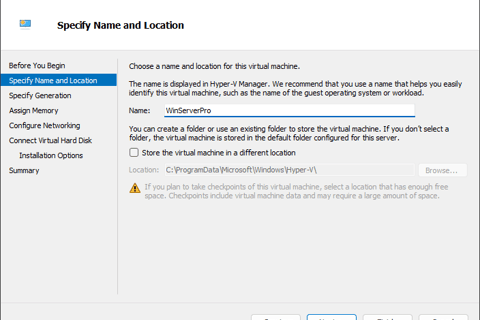 The next step is to assign a name to your virtual machine and optionally change the file location in which the virtual machine is going to be stored. For the sake of this tutorial, I am going to name the server “WinServerPro” and won’t be changing the default file location. After you have entered the relevant information, click “Next”: