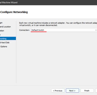 Next you will need to choose the network interface that is going to be used by the virtual machine. Assuming you want the VM to have an internet connection, select “Default Switch”, as this will just use the interface on your host machine: