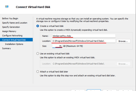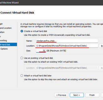 After you have configured the network settings, you will need to choose the size and location to store your virtual hard disk, this is essentially the storage volume for your virtual machine. In this tutorial we are going to create a new virtual hard disk. You simply need to name the hard disk and choose the size (in GB) for this guide I will be using 75GB and leaving the rest of the values as default: