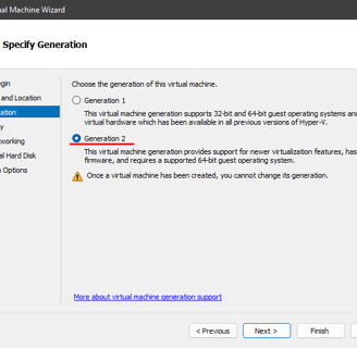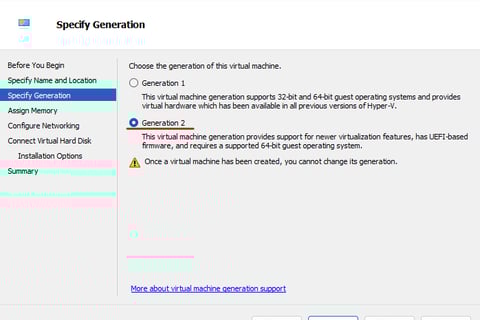 After entering the name of the VM, you will need to choose whether or not you want a generation 1 or generation 2 VM. The main difference between the two is that Gen2 uses UEFI-based firmware (Essentially modern BIOS settings) and Gen1 supports older operating systems. For Windows Servers (2016+), Generation 2 is typically the better option and for this reason, tick the generation 2 box and click “Next”: (Note: You cannot change the generation of the VM once it has been set).