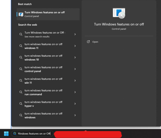 The first step in enabling Hyper-V is to navigate to the "Turn Windows features on or Off" menu (Be weary, this process will require a reboot of the machine). This can be done by searching for it in the Windows search bar, found in the bottom left hand-side of your screen: