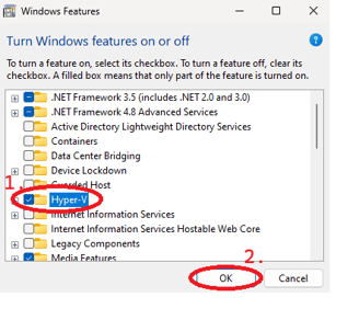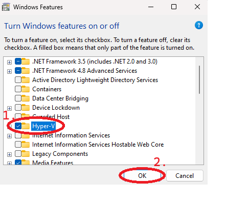 Once you have opened this menu, look for "Hyper-V", tick the box and select "OK":